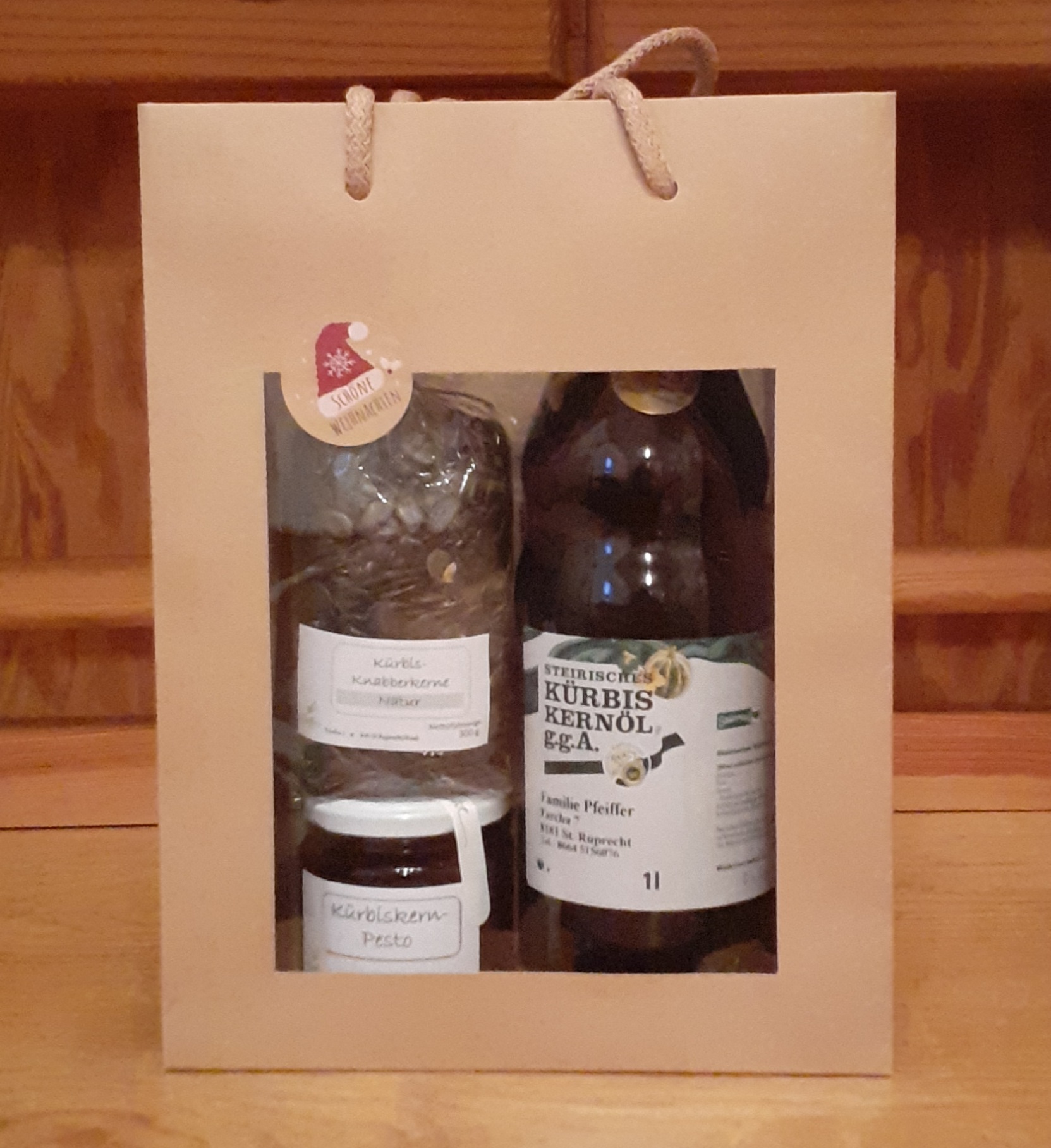 1x Kürbiskernöl 1l, 1x Kürbis Knabberkerne 150g, 1x Kürbiskernpesto 190g