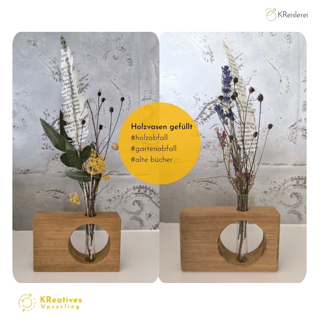 Die Holzvase wurde aus Holzabfällen gefertigt, die Trockenblumen sind aus dem eigenen Garten, die Feder wurde aus alten Büchern upgecycelt.
